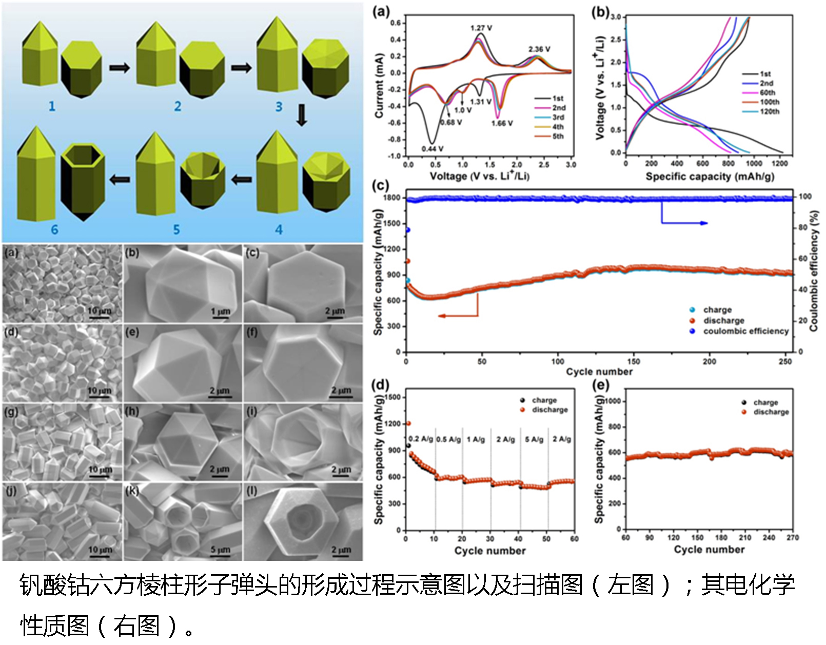 混合金属氧化物, 与简单的二元金属氧化物相比,因不同金属离子的协同效应等作用,改变和提升了材料的整体性能, 在能源转化和存储技术方面发挥巨大的作用,备受研究者的青睐和关注。金属钒酸盐, 作为一类重要的混合金属氧化物, 由于较难合成很少被研究。基于此,熊胜林教授课题组在含有一定量NH4+的水溶液中, 合成了尺寸和形状可控的新相Co3V2O8·nH2O六方棱柱形纳米铅笔, 通过精确调控溶液中OH-离子的浓度, 实现了从实心铅笔到空心结构的转变(见下图);另外, 我们将适量的NaOH加入到冷却后含有钒酸钴实心纳米铅笔的反应溶液中或是含有新制备的钒酸钴实心纳米铅笔的水溶液中, 再进行相同的水热反应, 该实心铅笔的尺寸和形貌没有发生变化, 因此, 其掏空过程不是因为碱性介质的刻蚀, 而是由于NH4+选择性吸附在某些晶面而抑制了一些晶面的生长所致。作为锂离子电池负极材料, Co3V2O8·nH2O纳米铅笔在500 mA g-1的电流密度下循环255圈, 可得到847 mAh g-1的放电容量。因其独特的结构和不同金属离子间的协同效应, 该纳米铅笔展示出高了可逆容量、极好的充放电循环稳定性和倍率性能, 在锂离子电池负极材料中显示了潜在的应用前景。