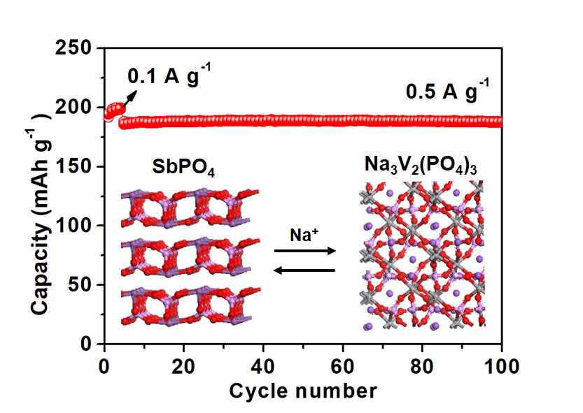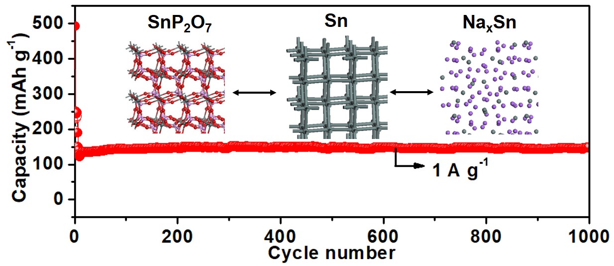 钠离子电池与锂离子电池相比具有储量丰富的优势,但存在化学性质活泼、半径大和质量较重的缺点。与此同时,目前常用的碳负极和过渡金属氧化物,并不能满足钠离子电池的负极要求。研究发现,基于合金化反应的负极材料Sb,Sb2S3,Sn,SnO2,SnSx等材料,具有较高的理论容量。然而,这些材料经常在循环时经受大量的体积变化和结构应变/应力,这很容易诱发结构解构、颗粒粉碎,从而降低性能。针对上述难题,公司钱逸泰院士团队的杨剑教授课题组研发数种新的磷酸盐体系, 利用P2O74-、PO43- 等阴离子较大的体积优势来稳定活性物质,缓冲体积变化带来的结构应力,提高材料的循环稳定性。同时,这种基于磷酸盐的负极材料以往报道很少。主要结果包括: