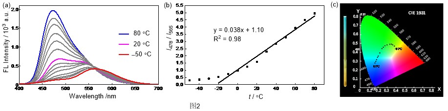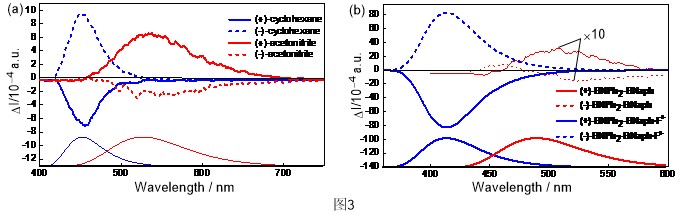 温敏荧光双发射和可转换的圆偏振发光(CPL)特性是有机小分子发光材料研究中两个非常有应用前景但又非常有挑战性的性能。为此,赵翠华教授课题组在最近的工作中,设计合成了一类新型的三芳基硼类衍生物,2,2’-二(N,N-二取代)氨基-6,6’-二(二米基硼)-1,1’-联萘(图1),与传统的具有D-p-A结构的三芳基硼不同,这一结构的1,1’-联萘衍生物实质上由通过单键相连的两个独立的D-p-A单元组成,这一独特的结构特性连同1,1’-联萘的轴手性以及硼取代的电子效应和位阻效应可以赋予整个体系其它手性有机小分子所无法实现的独特光学性能。研究发现利用这一骨架,仅仅通过简单地选择不同的氨基即可实现温敏荧光双发射和可转换的CPL特性这两个非常有挑战性的性能。当氨基为N,N-二甲氨基(NMe2)时,化合物BNMe2-BNaph在极性溶剂中具有温敏荧光双发射,两个发射峰位置差别显著,而且两个发射峰强度的比例随温度变化显著,是一个理想的比率型荧光温度探针(图2)。当氨基为大体积的N,N-二苯氨基时,化合物BNPh2-BNaph则在各种溶剂和固体状态下都具有非常强的荧光,而且当溶剂由环己烷转变为乙腈时,CPL信号不仅位置上发生大幅度红移,而且方向发生了反转。另外当溶液中加入过量的氟离子时,CPL信号不仅位置蓝移,而且强度增加(图3),不对称因子glum达到了1.6×10–2,这对于有机小分子而言是非常高的数值,这是迄今为止第一例同时具备溶剂和氟离子刺激响应CPL特性的有机小分子发光材料。彭谦研究员对该体系的发光机理进行了详尽的理论研究,揭示了低激发态和高激发态之间的竞争发射的双发射机理,合理解释了上述实验现象。该项研究为获得具有温敏荧光双发射和可转换的CPL特性的有机小分子发光材料提供了有效的分子设计方法和可靠的理论依据。