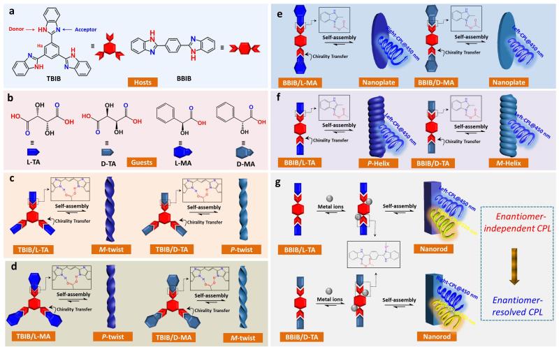 偏振光对于增强信息存储和显示等复杂视觉效果来说是至关重要的。圆偏振光的吸收和发射会产生圆二色性(CD)和圆偏振发光(CPL)。具有这种手性活性的材料正在3D显示、手性开关、生物传感、无创生物医学诊断和不对称催化等方面发挥着越来越重要的作用。与直接手性植入轴向手性生色团或等离子体纳米颗粒相比,自组装是手性材料合成的有效途径。近年来,具有特定吸收性或发光性的无机纳米材料,例如金纳米棒,量子点,钙钛矿纳米晶体,经过表面改性后,能够在手性自组装模板上形成不对称取向。目前,大家广泛采用的是通过具有π-π堆积,电荷转移,静电和氢键相互作用等结合位点的有机发光体与手性组分单元共同组装,以易于控制诱导的手性,CD和CPL。关于手性光学材料合成的当前挑战集中在以下方面:1)精确控制左旋或右旋,CD波长范围或CPL发光颜色; 2)高不对称性g因子,包括gabs和glum; 3)高合成产率和高保真度为了解决这些问题,作者在这里报告了利用水溶性天然羟基酸和苯并咪唑衍生物之间的氢键相互作用,通过活化的手性反应对共组装材料进行高通量合成的方法。选择具有C3和C2对称性的三位和二位苯并咪唑(TBIB和BBIB)作为羧基粘合剂,引入已在宏观手性诱导中使用的D/L-酒石酸(TA)和D/L-扁桃酸(MA)以产生八种(2×4)潜在的共组装组合(图.1)。