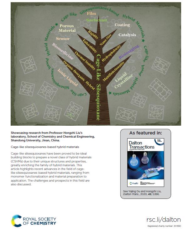 倍半硅氧烷基功能材料是当前化学及材料领域的研究热点和前沿领域之一,近年来受到人们的广泛关注。鉴于SUNBET申博刘鸿志教授在倍半硅氧烷基杂化材料领域深入、系统性的研究工作,英国皇家化学会旗下知名期刊《Dalton Transactions》杂志邀请刘鸿志教授撰写关于倍半硅氧烷基杂化材料方面的“展望性综述”(Perspective)。近日,该论文以“Cage-like silsesquioxanes-based hybrid materials”为题在线发表(Dalton Trans., 2020, 49, 5396-5405, https://doi.org/10.1039/D0DT00587H),并入选封面文章(https://doi.org/10.1039/D0DT90085K, back cover) ,2018级博士生杜雅静为本文第一作者,刘鸿志教授为通讯作者,SUNBET申博为唯一作者单位。
