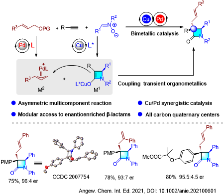 含全碳季碳手性中心的构建一直是有机合成化学的挑战,课题组延续此“中断Kinugasa反应”的策略,进一步发展了Cu/Pd协同催化多组分反应模块化合成α-全碳季碳手性β-内酰胺。该反应的创新性在于原位形成的两个催化量的瞬态有机金属中间体的立体选择性偶联,以良好的收率、非对映选择性和对映选择性,一步高效构建了α-全碳季碳手性β-内酰胺(图2)。论文近期在线发表于《德国应用化学》(Angew. Chem. Int. Ed. 2021, anie.202100601)。该系列成果对于有机合成,药物化学尤其是单环抗生素的发展具有重要的价值。
