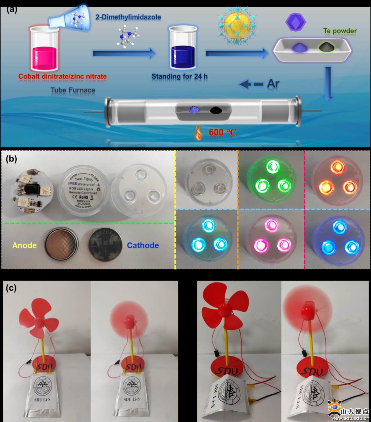 图1. Co0.9Zn0.1Te2@NC多面体电催化剂制备流程图及其作为电极材料点亮商用灯,驱动小风扇工作图
