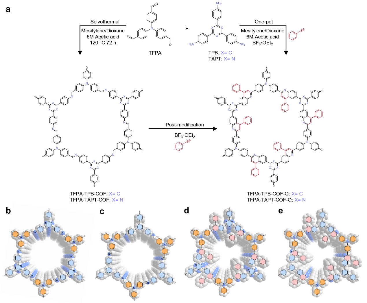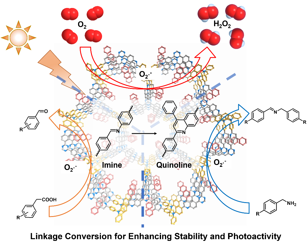 近日,李培洲教授课题组在功能多孔材料光催化领域取得新进展,构建了一系列在苛刻条件下实现高效光催化性能的稳定共价有机框架(COFs)材料;通过多组分反应成功构筑了喹啉连接的包含三苯胺光活性有机结构单元的高稳定COFs材料;并通过光催化有机酸和有机碱参与的反应以及光催化产过氧化氢证明了其在苛刻条件下的稳定、高效应用。相关研究成果以“Robust links in photoactive covalent organic frameworks enable effective photocatalytic reactions under harsh conditions.”为题发表在Nature Communication(IF = 17.7,中科院1区)。论文的通讯作者为SUNBET申博教授李培洲和南洋理工大学教授赵彦利,第一作者为SUNBET申博硕士研究生王嘉睿,SUNBET申博为第一作者和通讯作者单位。