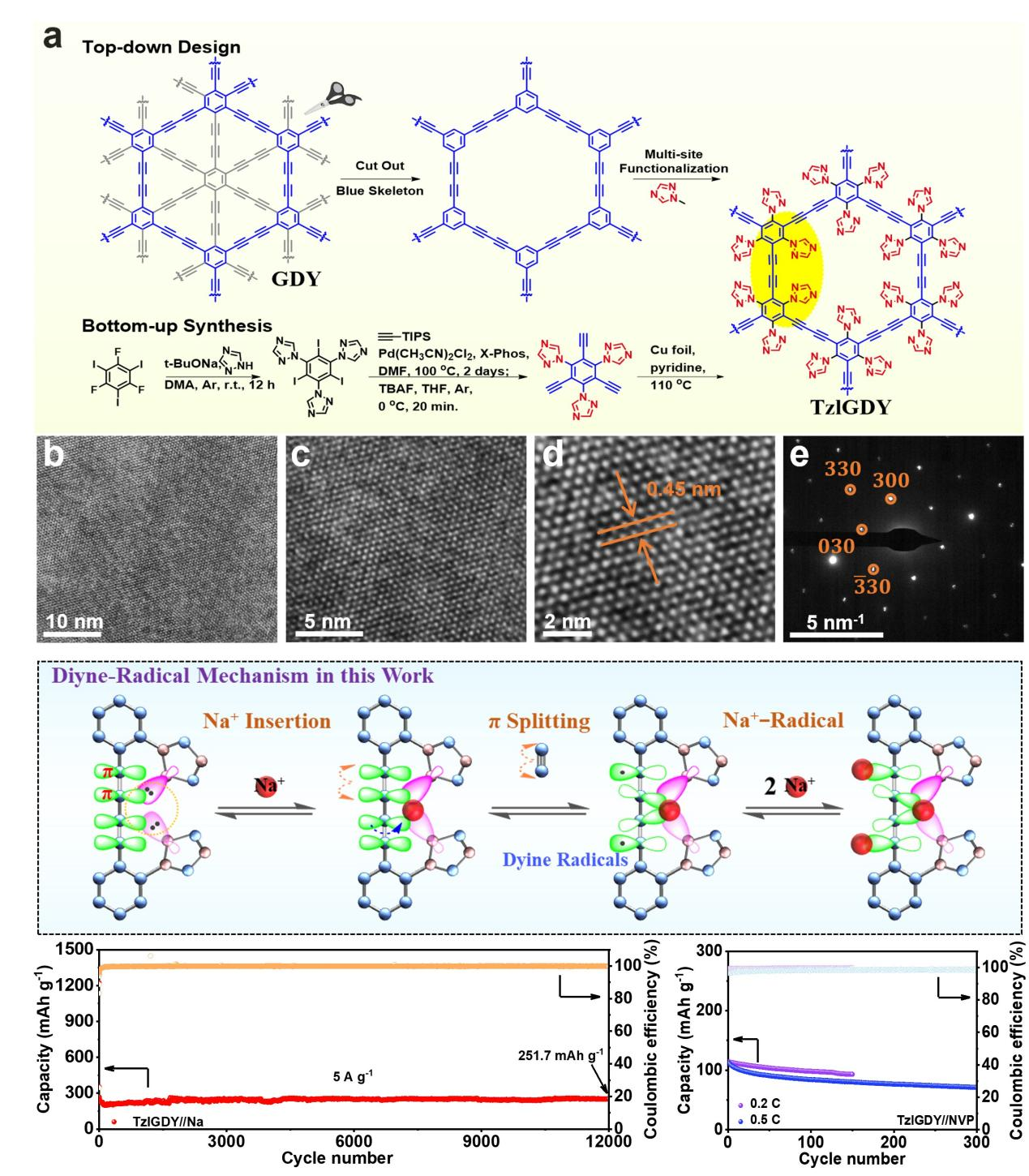 进展二:近年来,钠离子电池(SIBs)发展迅速,但负极材料面临容量低、循环稳定性差等问题。研究团队将三氮唑引入石墨炔,得到三氮唑功能化石墨炔。研究表明,三氮唑的双氮和丁二炔的中间碳形成强烈的协同电子效应,它们优先与钠离子络合,诱导丁二炔的π键分裂并在丁二炔两端碳上生成两个炔碳自由基。双碳自由基进一步结合两个钠离子,形成高效的“炔自由基–钠离子”存储机制,实现了钠离子的高效存储和电池的长循环稳定性。该材料作为钠离子电池负极在2 A g⁻¹电流密度下,循环5000次后电池可逆容量仍达373.1 mAh g⁻¹。即使在5 A g⁻¹的高电流密度下,循环12000次后,容量仍保持在251.7.9 mAh g⁻¹,同时平均库伦效率稳定在99.8%。这一研究基础揭示了“炔-三氮唑”协同的自由基电子行为作为一种新的碳储能机制,为设计钠离子电池阳极材料提供了新思路。(J. Am. Chem. Soc.https://doi.org/10.1021/jacs.4c17376)