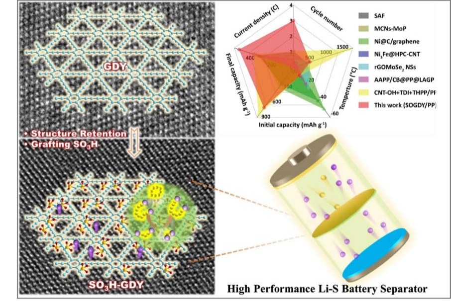 进展一:针对锂硫电池中锂枝晶生长和多硫化物穿梭问题,研究团队制备了晶态的磺酸功能化石墨炔。磺酸基团的强吸电子效应强化了石墨炔骨架的表面电子不均匀性,提高了对多硫化物的催化转化性能;同时强吸电子效应导致氢离子快速解离,降低了电场下锂离子的迁移能垒,有助于锂离子的快速输运;磺酸基团的静电排斥效应、多氧位点与亚纳米孔协同的空间限域效应有效抑制了多硫化物的穿梭;晶态有序排列的三角孔有利于锂离子的均匀沉积,从而有效抑制了锂枝晶的生长。该磺酸石墨炔作为锂硫电池隔膜,有效解决了锂枝晶生长和多硫化物穿梭问题,实现了锂硫电池在低温(-10 ℃)和大倍率(3 C)下的稳定循环。该研究表明,在保持晶态结构下,磺酸基团的多重电子效应优化了石墨炔的孔性质,提高了离子输运性能和对多硫化物的催化转化能力。(J. Am. Chem. Soc. 2024, 146, 23764−23774)
