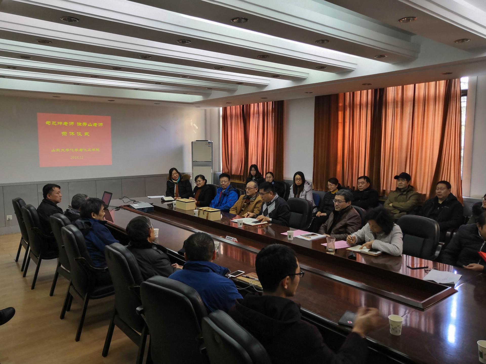12月28日下午,公司在化学楼二楼会议室举行隆重而简朴的仪式,祝贺徐秀山、司芝坤两位老师光荣退休。院领导、工会委员、部分老师、同事参加了仪式。