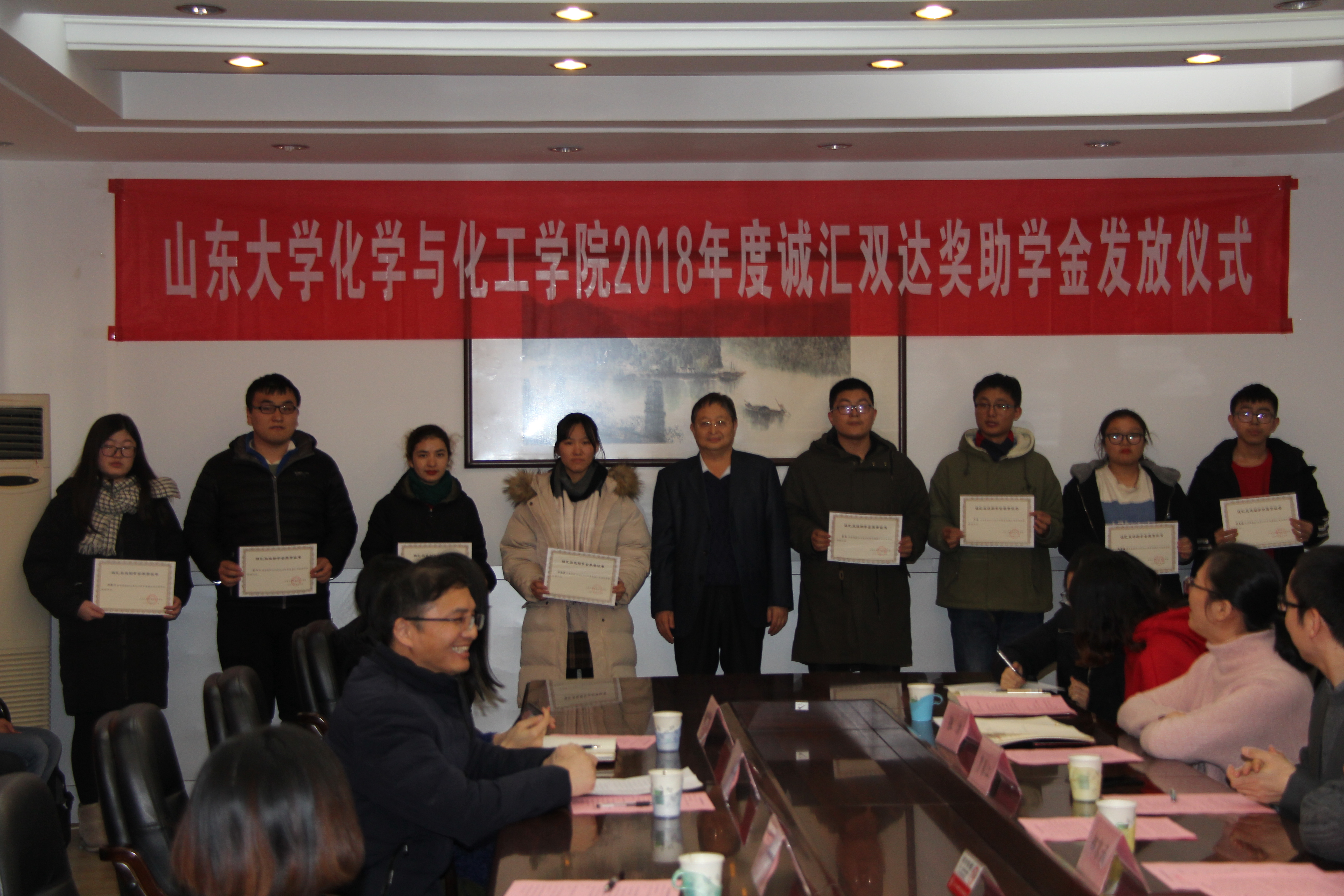 2019年1月3日下午,SUNBET申博2018年度诚汇双达奖助学金发放仪式在化学新楼举行。济南诚汇双达副董事长兼总工于东海,总经理王庭见,人事行政总监于小颖,人事行政部长李金凤;SUNBET申博经理郝京诚,副经理贾春江,党委副书记孙国翠,团委书记张洁出席了仪式。仪式由孙国翠主持。