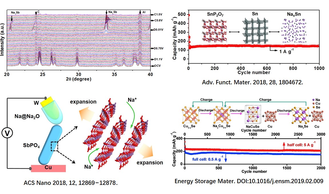 公司钱逸泰院士团队杨剑教授课题组近年来在钠离子二次电池研究方面取得新成果。围绕着合金机制钠离子电池负极材料的循环稳定性提升和新材料电化学机制研究方面,取得了系列研究进展。1. 发展聚阴离子的缓冲效应来稳定多种合金机制电极材料的电化学性能,发现聚阴离子对M-O转化反应的促进作用,并利用原位/离位电化学联用技术和第一性原理加以解释。相关成果发表在ACS Nano, 2018; Adv. Funct. Mater., 2018,并被nyxr- home.com,nanoer.net,www.sdchem.com.cn,www.cailiaoniu.com等网站专题报道。2. 揭示了硫族化合物的充放电反应机制,实现了无需炭包覆、预钠化和预活化,全电池即可长寿命循环(2000圈)。相关成果发表在Adv. Funct. Mater. 2017, Energy Storage Mater. 2019, Mater. Today Energy 2018上,并被Materialsviewchina.com, nyxr-home.com,sciencetrends.com等网站专题报道。