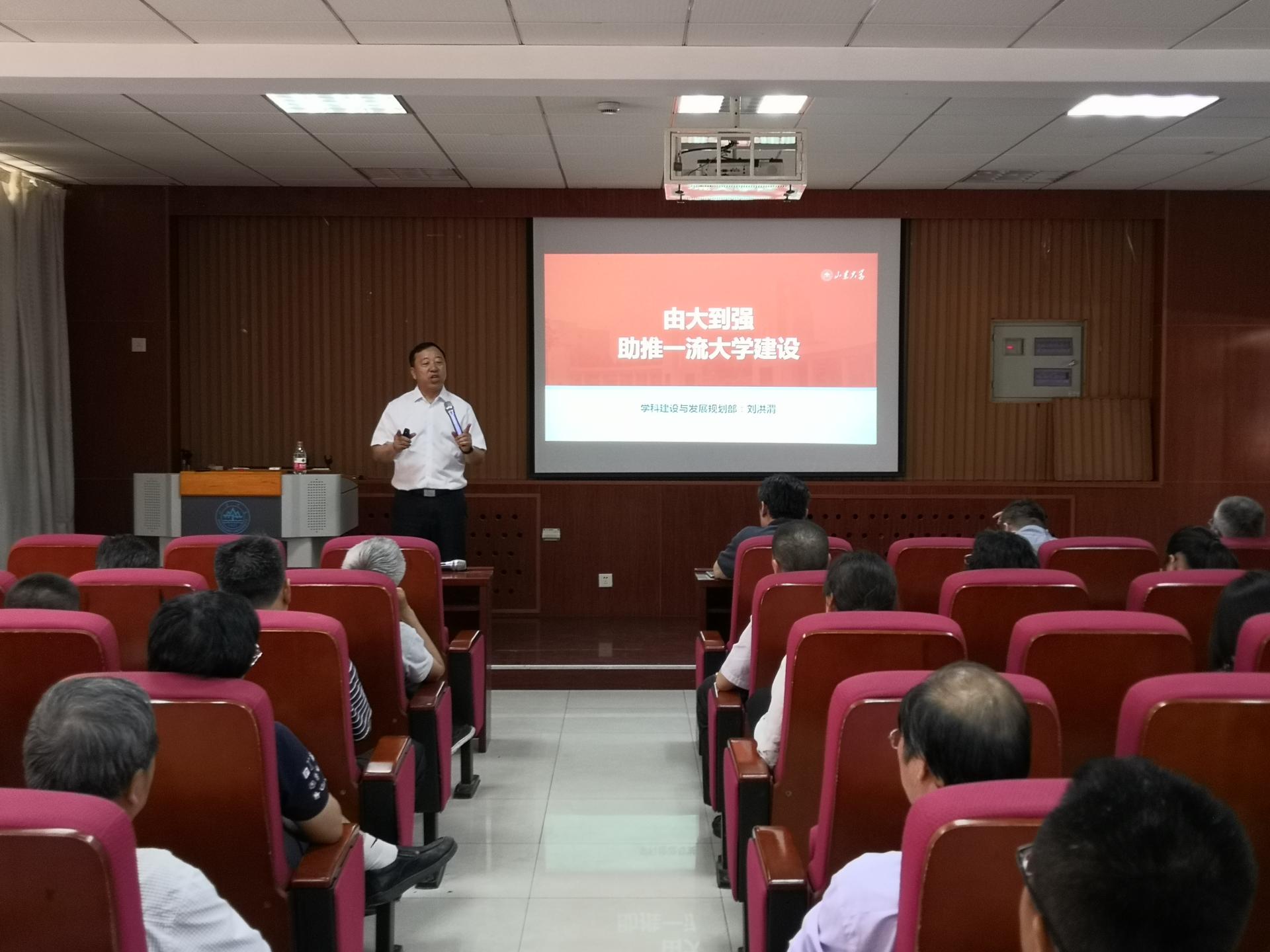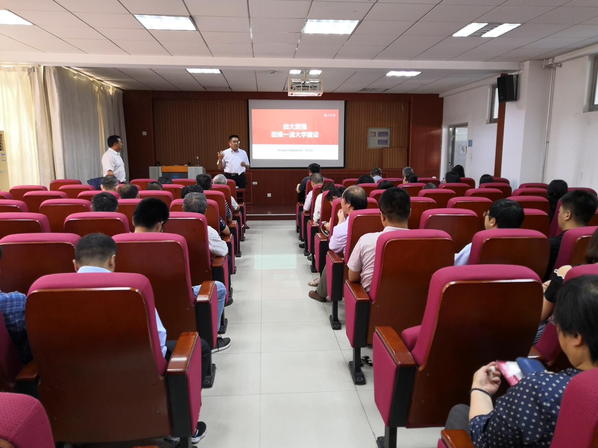 5月23日,化公司在生物北楼一层报告厅举办首期“政策化+”校院对接论坛。团队建设与发展规划部刘洪渭部长受邀作了题为《由大到强 助推一流大学建设》的专题报告,并就“双一流”建设及强院兴校等有关问题与化公司教师代表进行了互动交流。公司各研究所(中心)所长(主任)、党支部书记,各学科学术带头人、学术骨干和教师代表、全体行政管理人员等参加了此次活动。论坛由经理郝京诚主持。