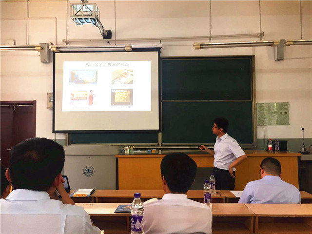 钟海政教授在报告中首先介绍了量子点研究与应用的发展历程,阐明了硒化镉和磷化铟量子点在应用工艺上的局限性。随后,钟教授详细介绍钙钛矿量子点近年来的研究进展。针对光电集成应用需求,其课题组发明了钙钛矿量子点的原位制备技术,利用钙钛矿材料的溶液加工特性,通过引入聚合物或者有机分子配体控制结晶过程,在聚合物基质中直接制备出量子点,或者在ITO基片上控制成核和生长过程直接制备量子点电致发光薄膜,为发展量子点集成应用提供了性能更加优异的材料和简便的集成技术。报告会后,钟教授与在场师生在理论研究、应用进展、实验细节等方面展开了广泛深入的讨论。钟教授的报告激情四溢,回答问题浅显易懂,与场的师生进行了充分的学术交流,为从事相关研究的师生开拓了研究思路。