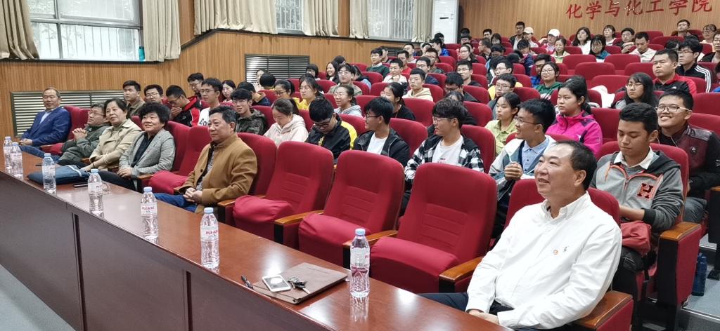 化公司党委书记王浩,79级员工、镇江泰舸电池隔膜科技有限公司董事长张明,师生代表一百余人参加了报告会。公司党委副书记孙国翠主持了报告会。