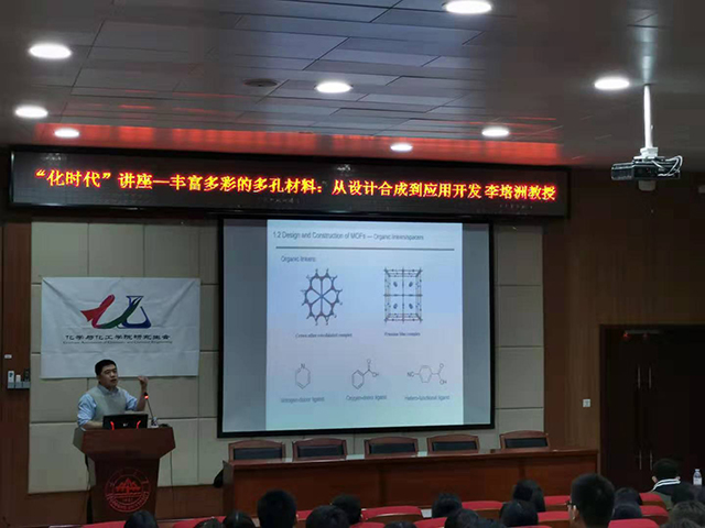 李培洲教授首先向同学们介绍了金属有机框架材料(MOFs),他主要围绕MOFs的设计与结构、性能与应用、历史和发展及研究成果和进展进行了讲解,详细阐述了MOFs的各种结构、富氮基MOFs对CO2选择性吸附和分离的性能研究、大孔MOFs对有机大分子的选择性吸附和分离、纳米催化剂负载、基于“逐层剥离”法的薄层纳米薄膜的制备。最后李老师还以幽默风趣的方式,向同学们展示了个人求学经历,鼓励同学们在科研中要耐得住寂寞,受得了挫折。