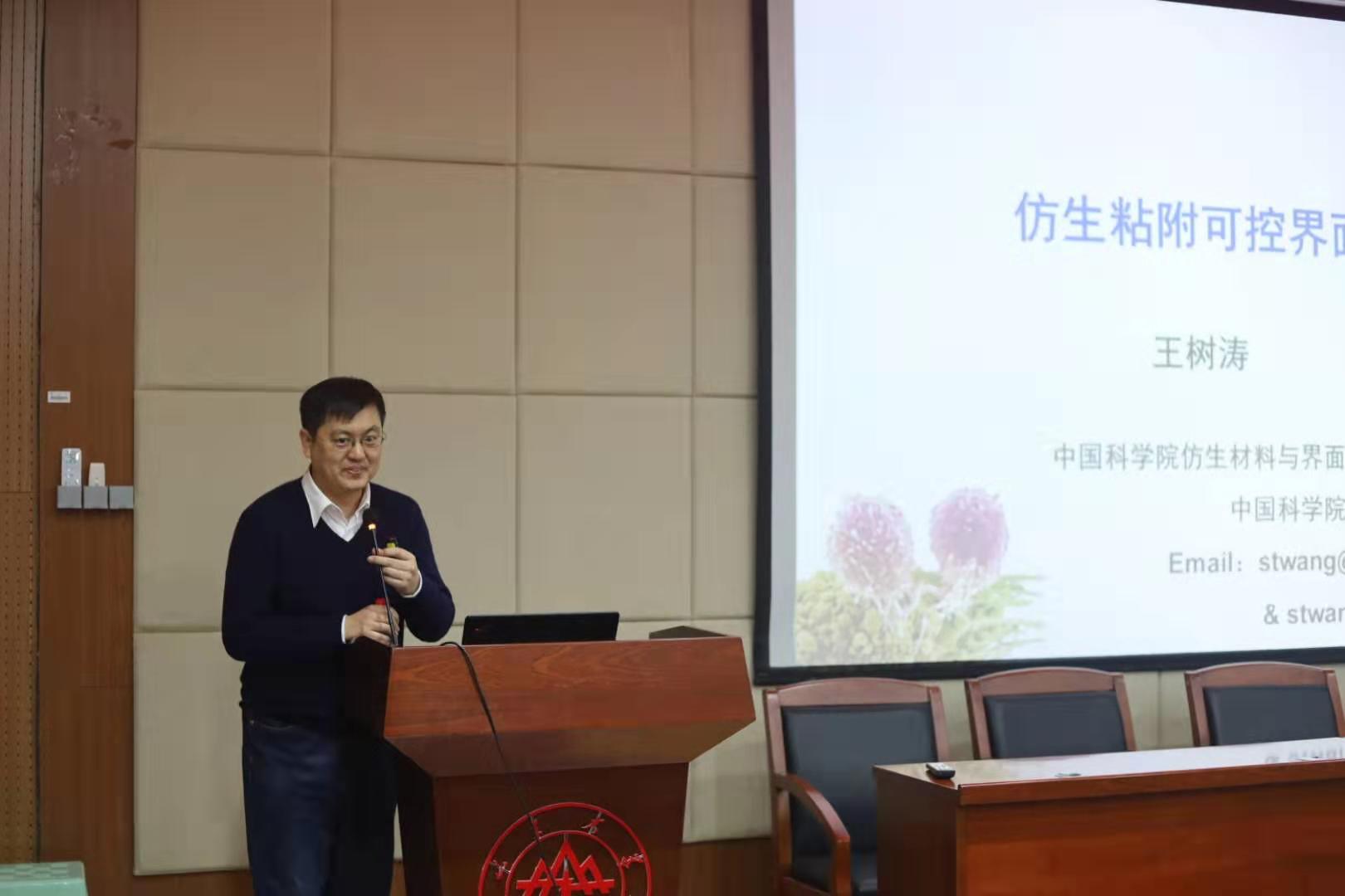 仪式过后,中国科公司理化技术研究所所长助理、长江学者、杰青王树涛开始了“菁英班”开班第一课的讲授,他向同学们简单介绍了中科院理化所的发展历史、发展近况以及科研实力,分析了未来自然科学学科前沿研究领域的交叉趋势,与大家分享了自己的科研工作。他鼓励大家培养多学科交叉思维,“当你读研究生或者工作的时候会发现,很少有纯粹的学科,知识会用得特别综合,所以在读大学时,同学们心中就应种下这颗种子,做好储备”。