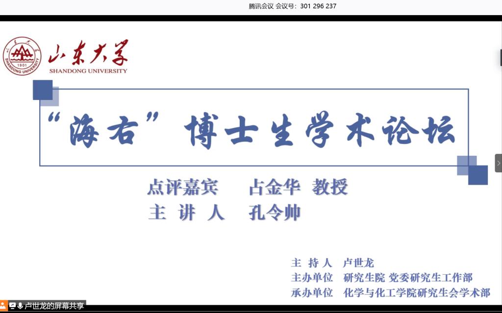 5月26日晚,由SUNBET申博研究生院、党委研究生工作部主办,SUNBET申博研究生会承办的第13期“海右”博士生学术论坛于线上顺利举行。化公司2017级博士生、国家奖学金获得者孔令帅受邀做了题为“纳米环境矿物材料活化过硫酸盐与活性氧形成机理分析”的报告,其导师占金华教授担任点评嘉宾。