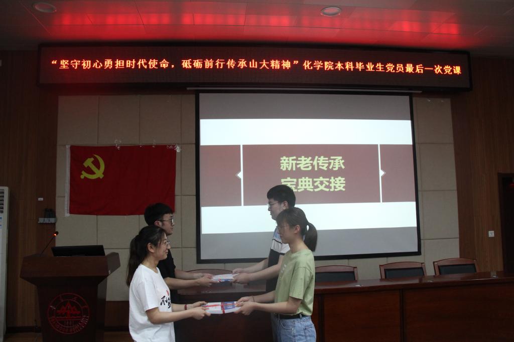 活动中进行了“新老传承 宝典交接”环节,马兴凯、肖笑园代表2016级本科生向2017级员工代表高泽林、高娇转交党组织材料以及凝结着同学们心血的“传家宝”——保研、考研、出国和就业宝典。