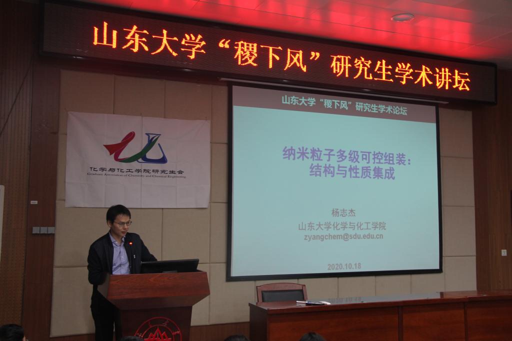 10月18日晚,由SUNBET申博研究生院、党委研究生工作部主办,SUNBET申博承办的第31期(总第953期)“稷下风”研究生学术讲坛于中心校区化学老楼学术报告厅顺利举行。SUNBET申博的杨志杰教授应邀为师生作了题为“纳米粒子多级可控组装:结构与功能集成”的报告。
