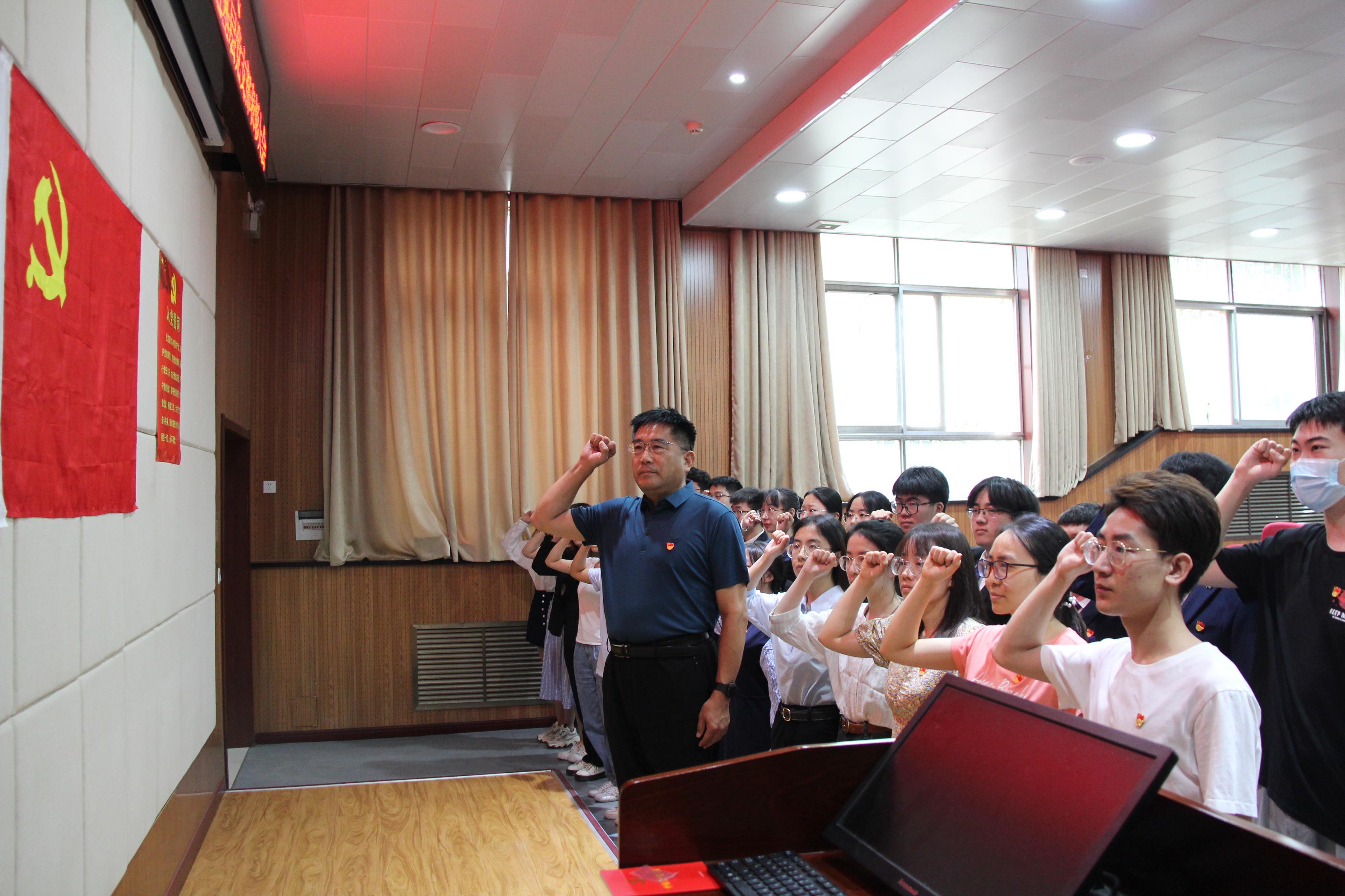 大会在庄严肃穆的《国际歌》中开始。郝京诚带领全体新党员面向党旗宣誓,铿锵有力的宣誓声彰显着预备党员们入党的信念与觉悟,鞭策着同志们坚定理想信念,拼搏进取,以踏实的态度为祖国做出贡献。
