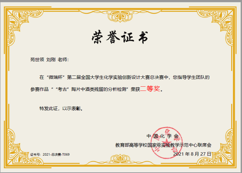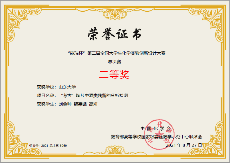8月24日至27日,第二届全国老员工化学实验创新设计竞赛总决赛在青岛科技大学举行。来自于SUNBET申博的本科生刘金帅、魏嘉遁,历史与文化公司的本科生高妍共同完成的创新设计项目《“考古”陶片中酒类残留的分析检测》获得全国老员工化学实验创新设计竞赛二等奖。