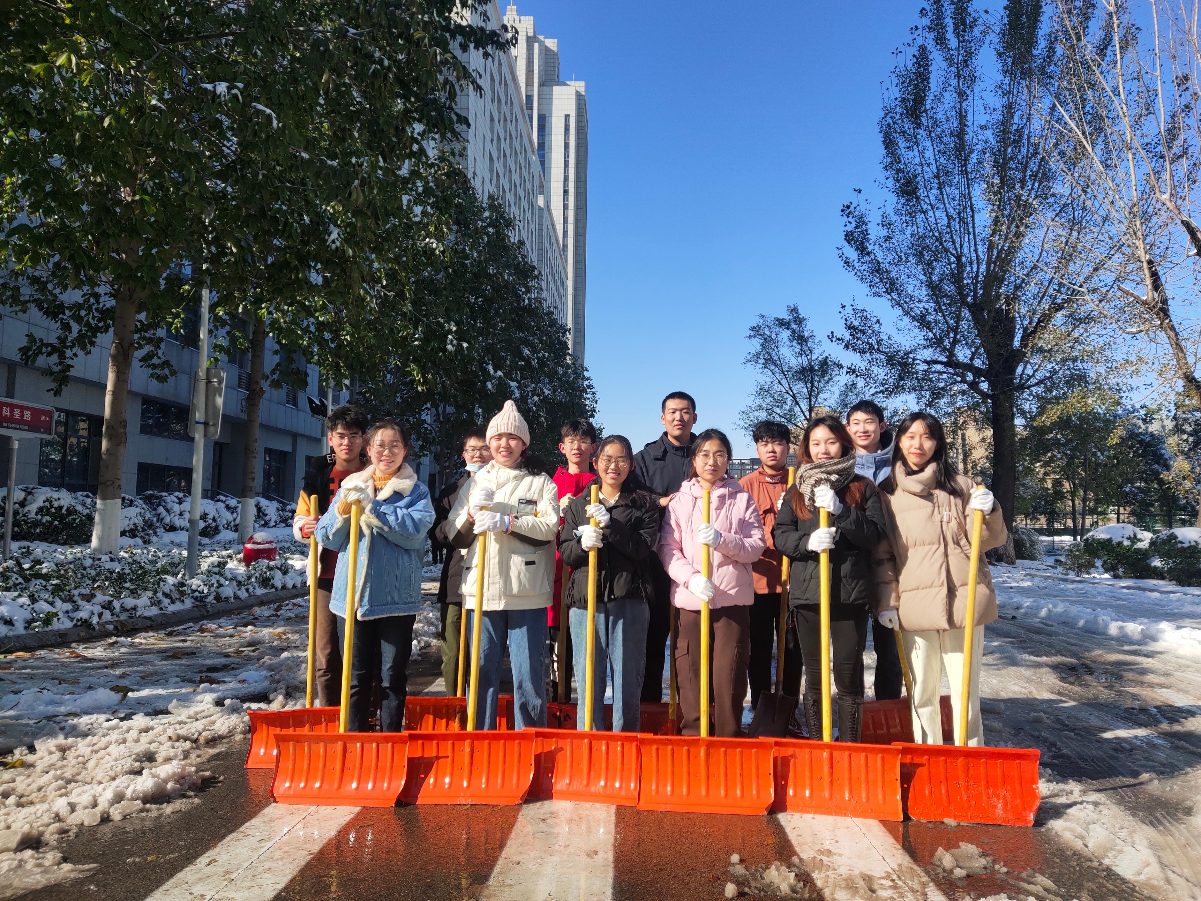 11月7日,受强冷空气影响,济南出现降温大雪天气,校园内积雪覆盖道路,带来安全隐患。为确保校园安全,方便师生出行,公司组织40名本科生参与校园扫雪工作。