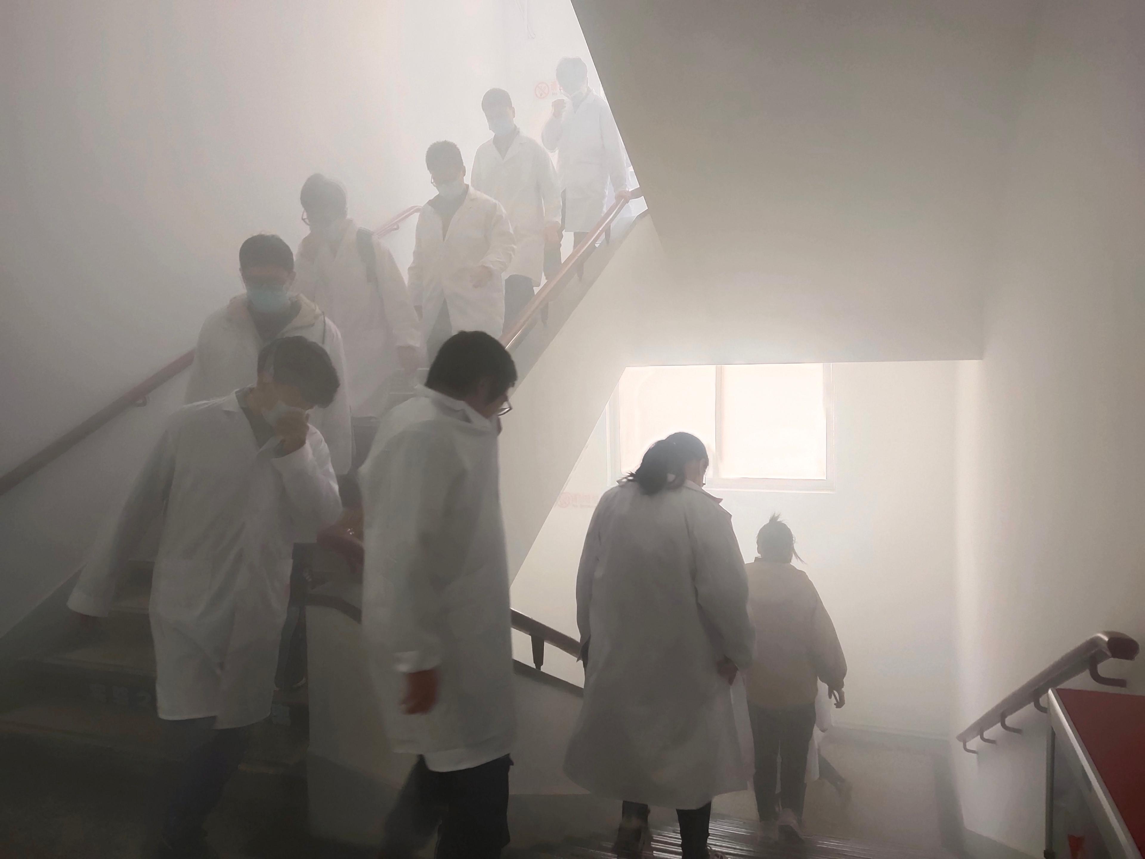 “化学楼出现火情,请同学们做好防护,有序撤离!”随着广播的响起,演练正式开始。化学老楼中冒出滚滚浓烟,楼内消防报警系统第一时间发出警报,一场真实场景下的消防疏散演练随即展开。在公司公共安全平台远程广播引导下,楼内正在上课的师生快速有序撤离到安全区域。在之后进行的消防灭火演练中,公安处负责人向师生详细介绍灭火器的使用方法,并进行了灭火演示,随后同学们分组使用灭火器体验了真实灭火操作。活动结束后,集团公安处安全科科长杜春兴和化公司实验教学中心主任宋其圣分别对本次活动进行了点评和总结。