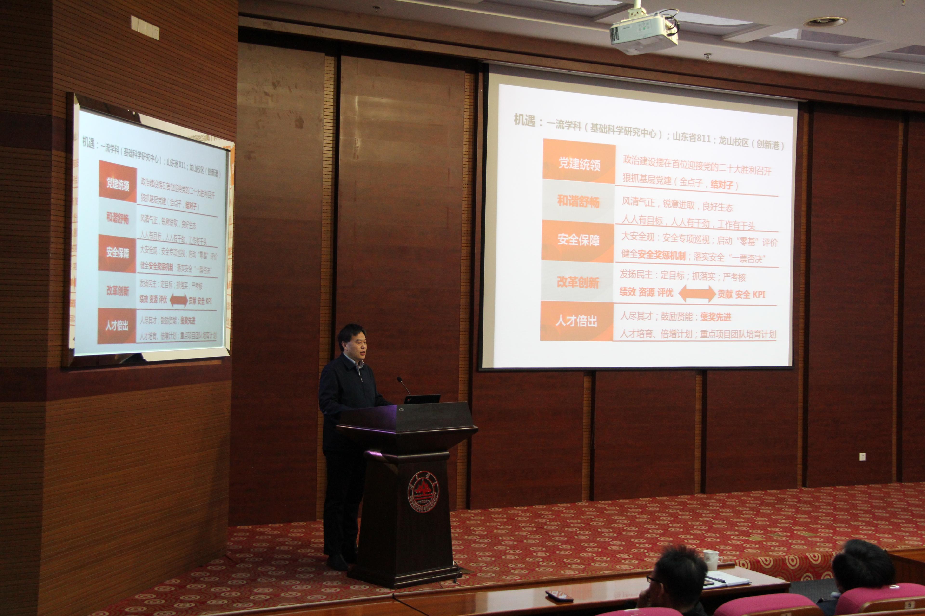 会上,王琪珑从贯彻落实《关于深入推进世界一流大学和一流团队建设的若干意见》,推动公司实现内涵式高质量发展出发,部署公司重点工作。王琪珑指出,面对新的形势任务,公司既要聚势谋远,更要精耕细作,通过全体教职工的努力,展现山大化学学派风范。一要做党建领航的模范,在改革发展、安全稳定、常态化疫情防控工作中要充分发挥公司党委政治核心、党支部战斗堡垒作用、党员先锋模范作用。二要厚植人才成长的沃土,全面总结公司在人才培养上的成功经验,认真落实立德树人根本任务;进一步营造良好的学术生态,提炼公司文化和价值追求,培育建设高水平科研团队。三要打造追求真理的乐园,继续浓厚和活跃公司学术氛围,前瞻布局新兴学科方向,重视培养年轻教师,鼓励和激励开展原创性工作研究。
