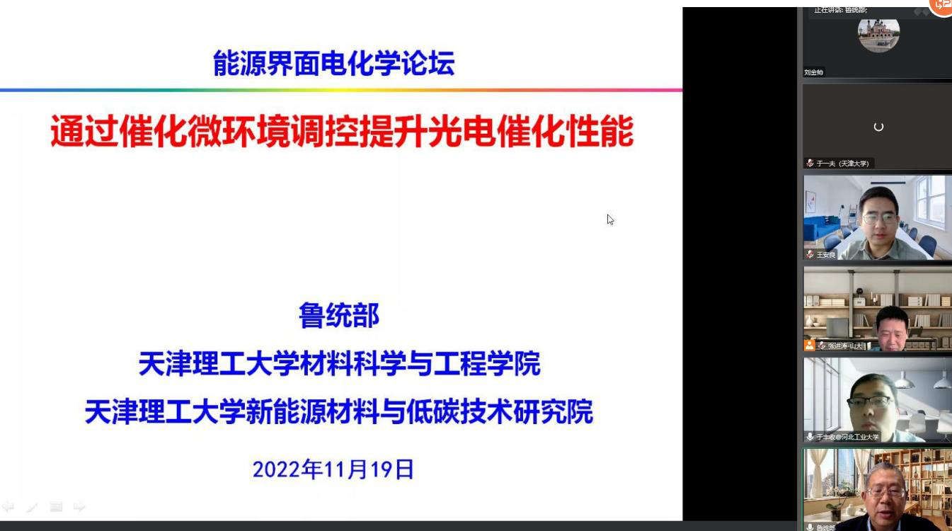 天津理工大学鲁统部教授围绕催化微环境的调控策略提升光电催化性能等相关研究作精彩演讲;北京航空航天大学水江澜教授分享了在高性能低铂、非铂燃料电池氧还原催化剂领域的研究成果;中科经理春应化所张新波教授分享了在新型电化学储能与转化技术关键材料与器件研究方面的科研心得。与会学者还就原位电化学的数据获取与解析及表征技术问题和模型的构建等方面进行了深入交流探讨。