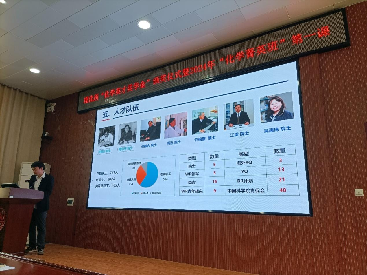 会后,孙国翠宣读了2023年度理化所“化学英才奖学金”获奖名单,侯兴合、丁黎为获奖同学颁奖并合影留念。随后组织2024年“化学菁英班”选拔面试。