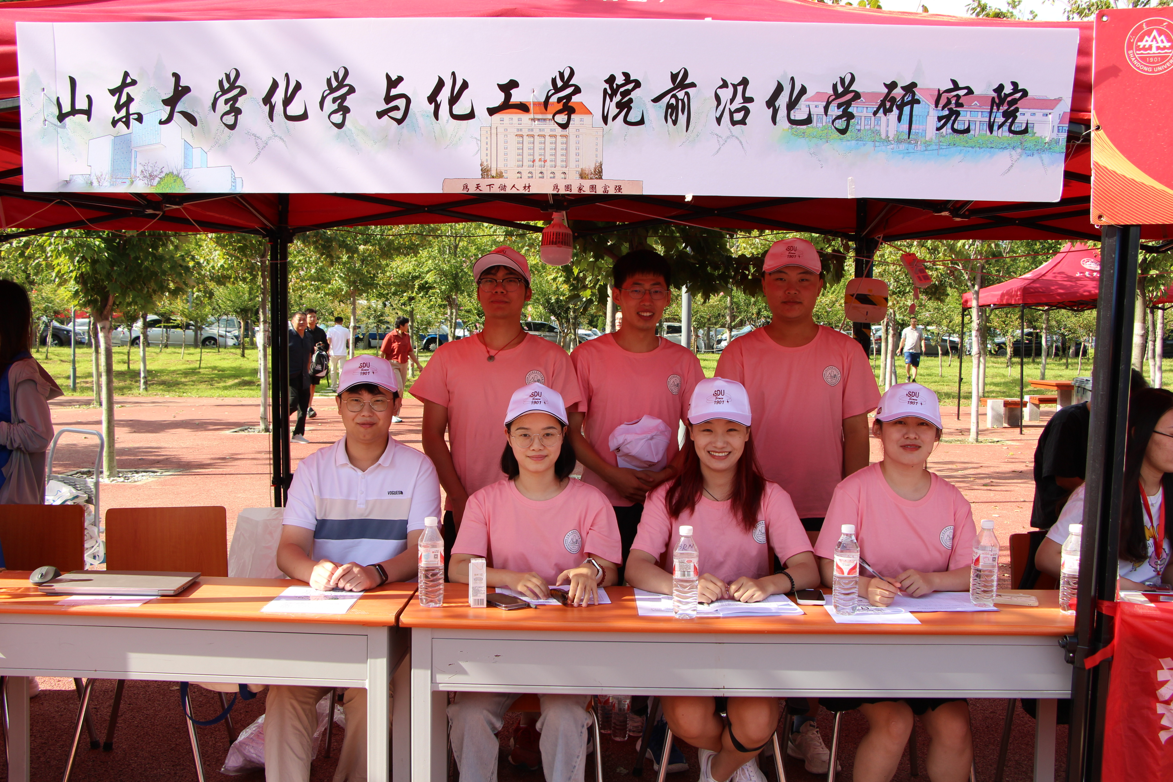 迎新现场,志愿者们集合完毕,准备迎接第一批新生。
