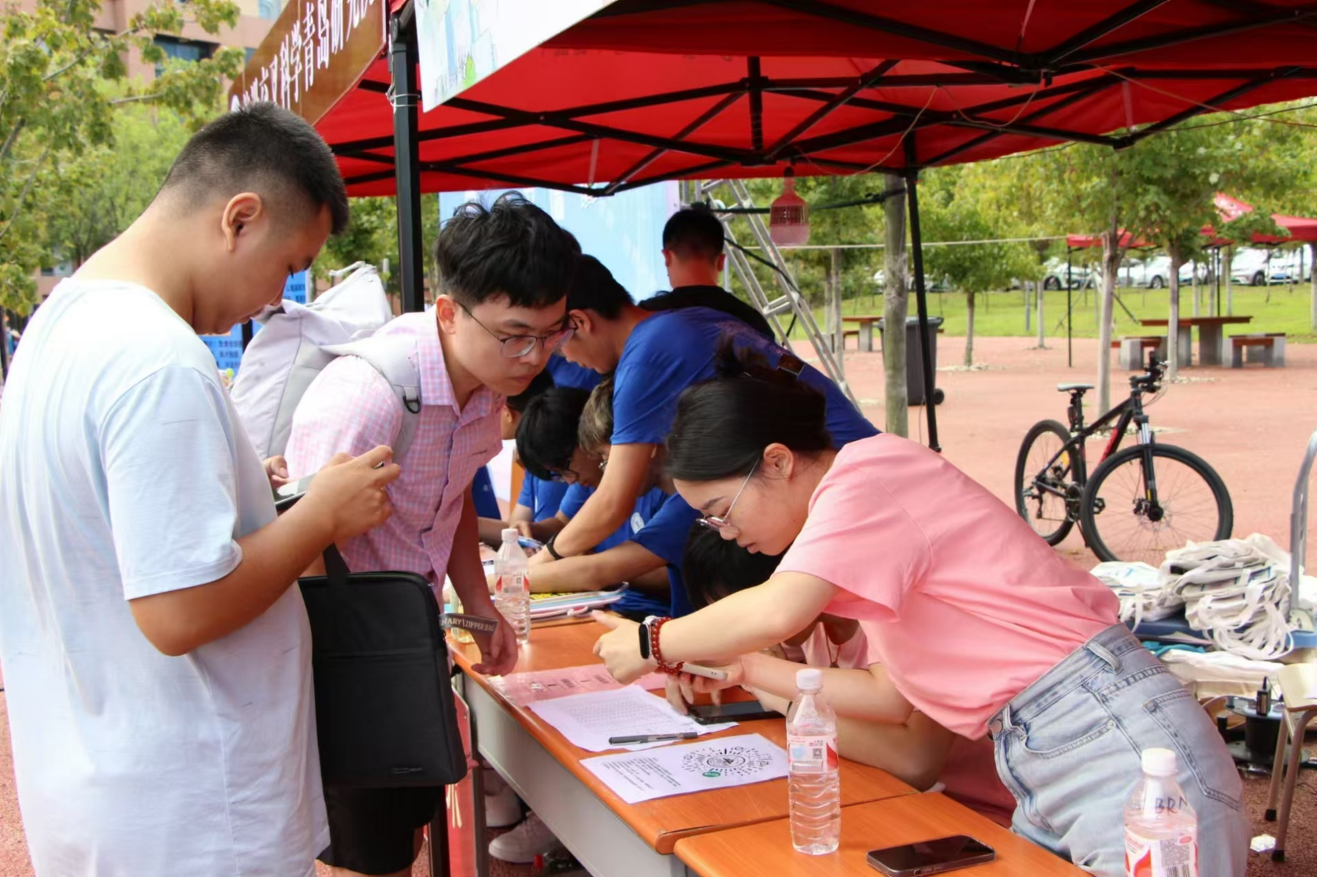 2024级的新生们在志愿者们的帮助快速有序地完成报到,领取公司为新生准备的大礼包等物品。