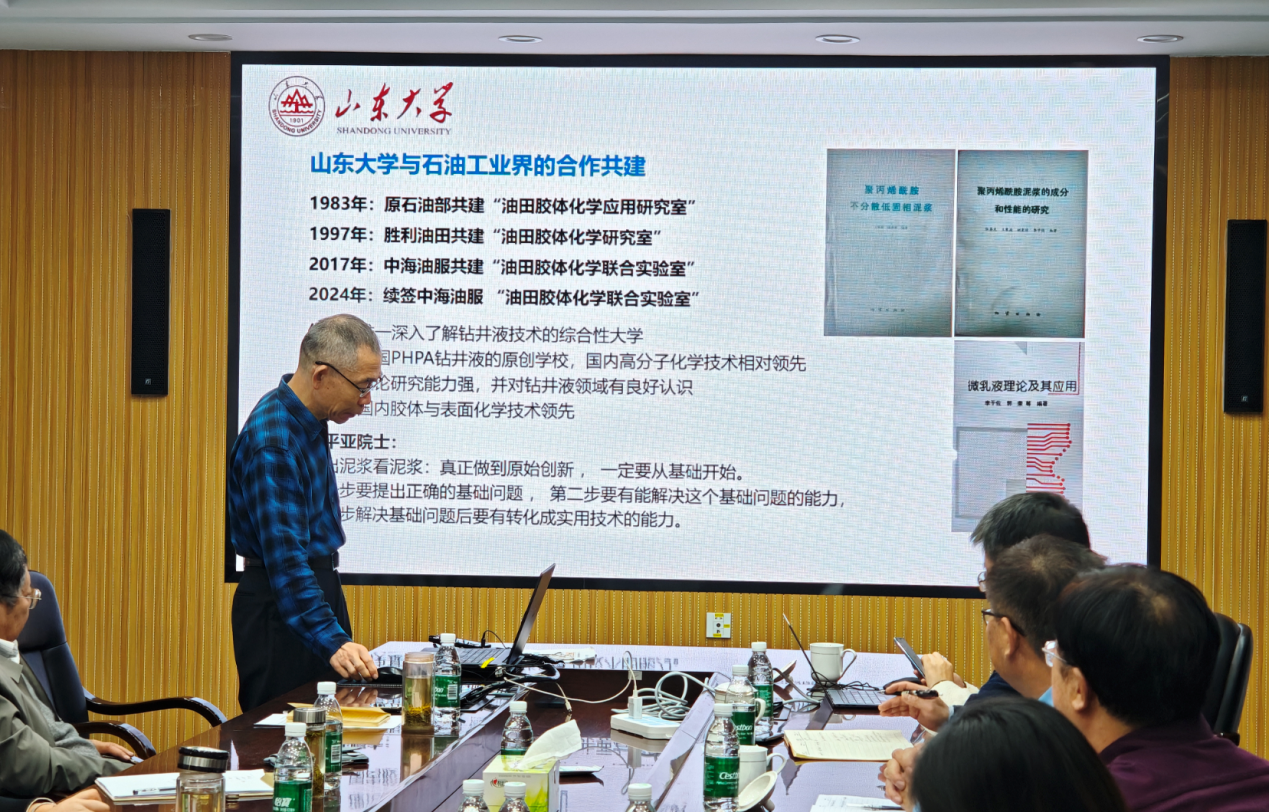 孙德军教授作了题为“油基钻井液体系的构建及清洁生产”的学术报告。回顾了山大人投身祖国石油事业,建功立业的故事,并介绍了公司在钻井液体系开发中的系列研究工作。来访专家就油基钻井液用抗高温乳化剂、超支化聚合物、生物质合成基钻井液作用机理等拟与SUNBET申博开展的合作攻关意向与山大进行交流讨论。