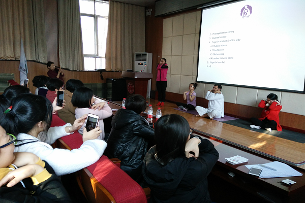 本次讲座由济南舍纳瑜伽免费授课。讲座伊始,刘红副书记代表化公司对舍纳瑜伽团队表示热烈欢迎。之后由舍纳瑜伽的负责人张娜教练主持讲座,张教练协同舍纳瑜伽的讲师SANJAY YOGI从五个方面给老师和同学们上了一堂生动的瑜伽课。首先谈到了春季养生。一年之计在于春,春季养生对于一年的身心健康非常重要。其次讲师当堂展示了一些简单且利于调养肝的瑜伽体式。之后,讲师教老师和同学们练习了瑜伽的呼吸方式——能量通道呼吸法。接着,讲师特意针对女性,亲自展示了几种简单易学的利于办公室女性身体健康的体式。最后,讲师还讲到了女性比较关注的话题——如何减肥。最后的现场互动环节,同学们积极参与,讲师耐心回答,并针对同学提出的问题,亲自指导同学在现场完成体式。