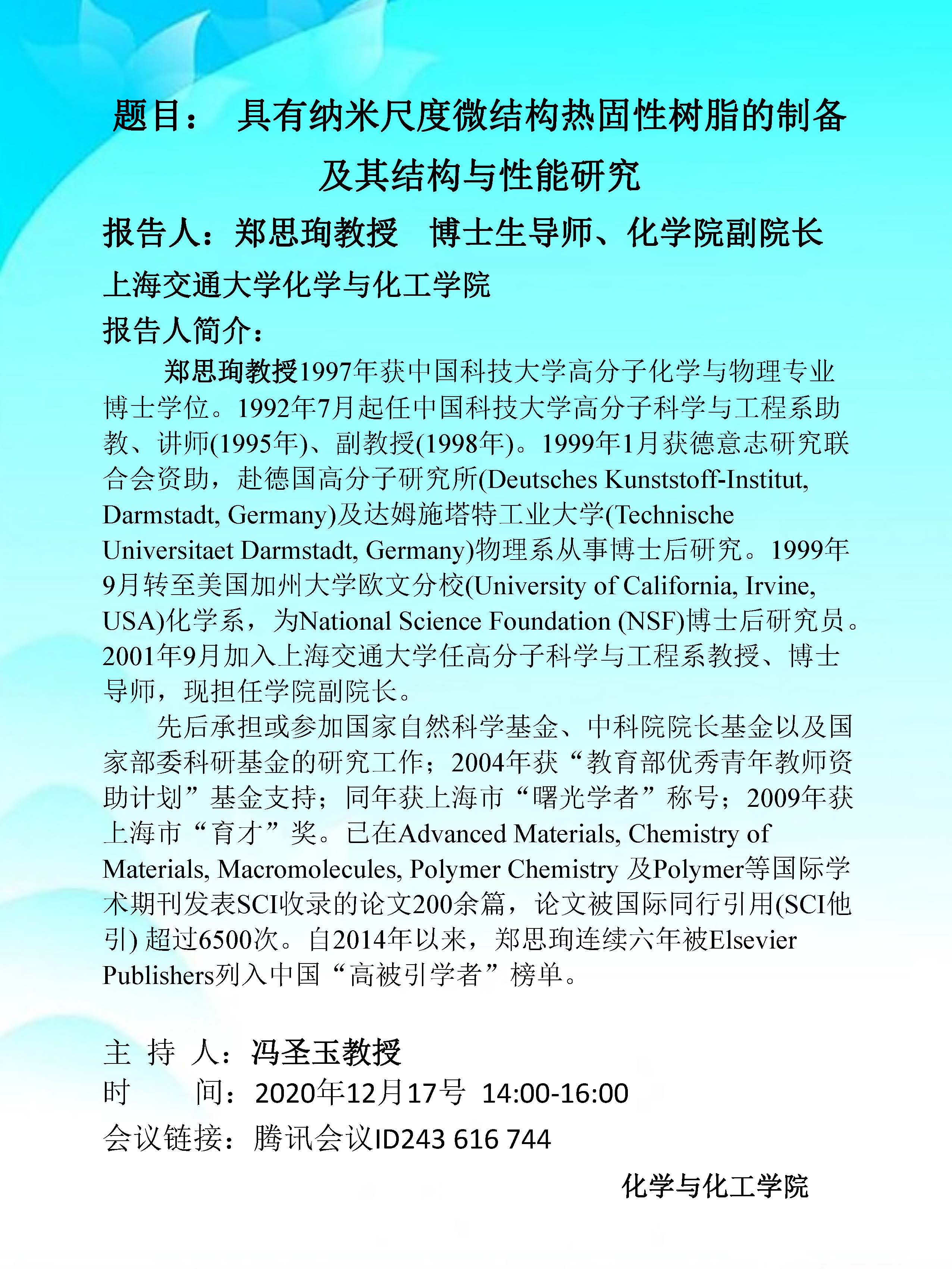 郑思珣教授学术报告:具有纳米尺度微结构热固性树脂的制备及其结构与性能研究