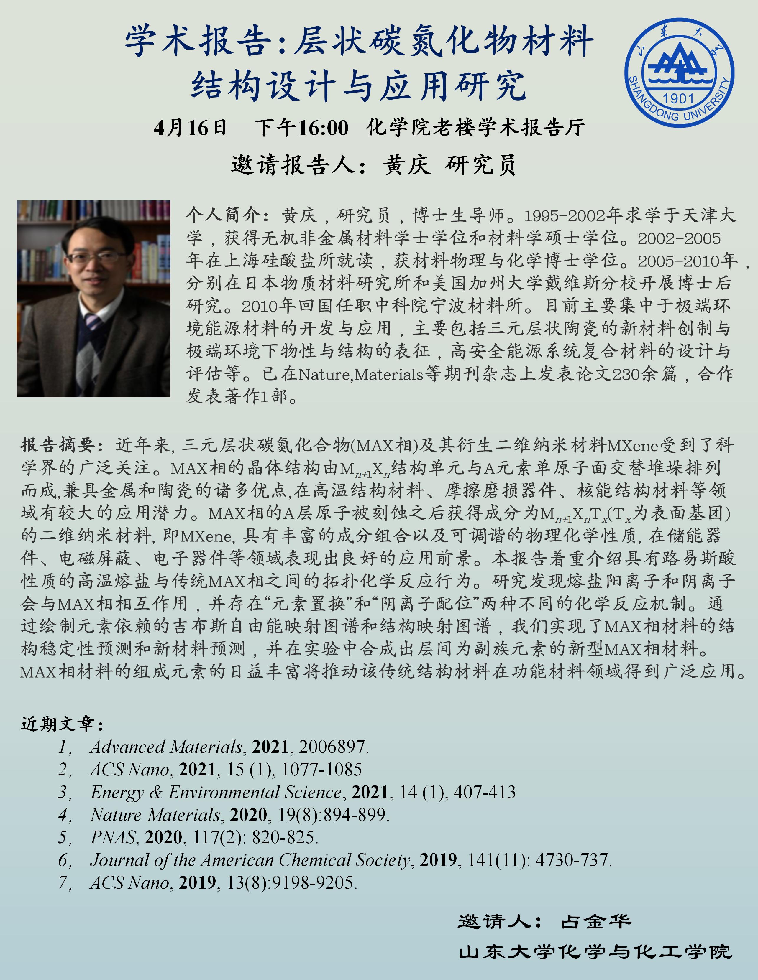 黄庆研究员学术报告:层状碳氮化物材料结构设计与应用研究