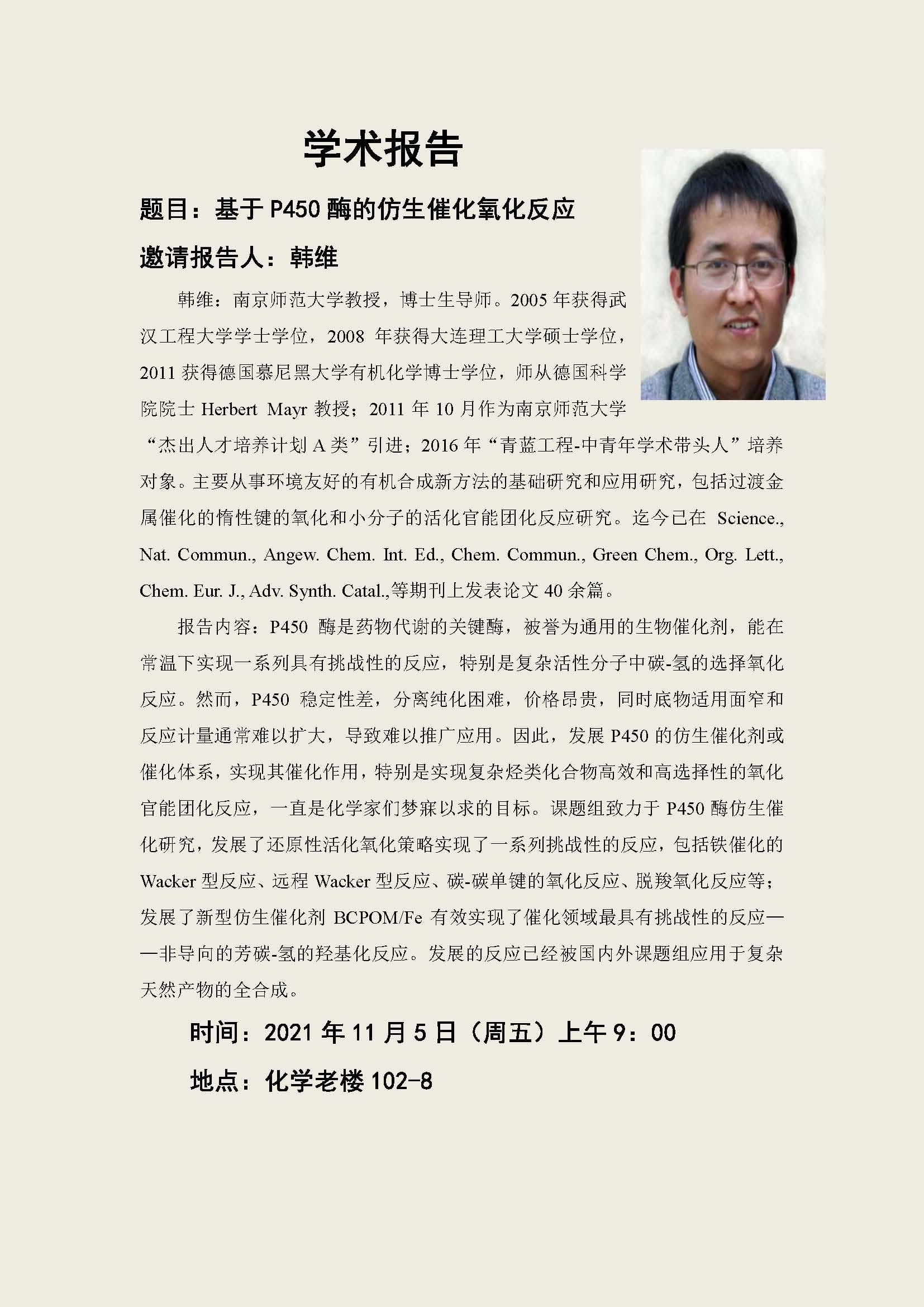 韩维教授学术报告:基于 P450 酶的仿生催化氧化反应