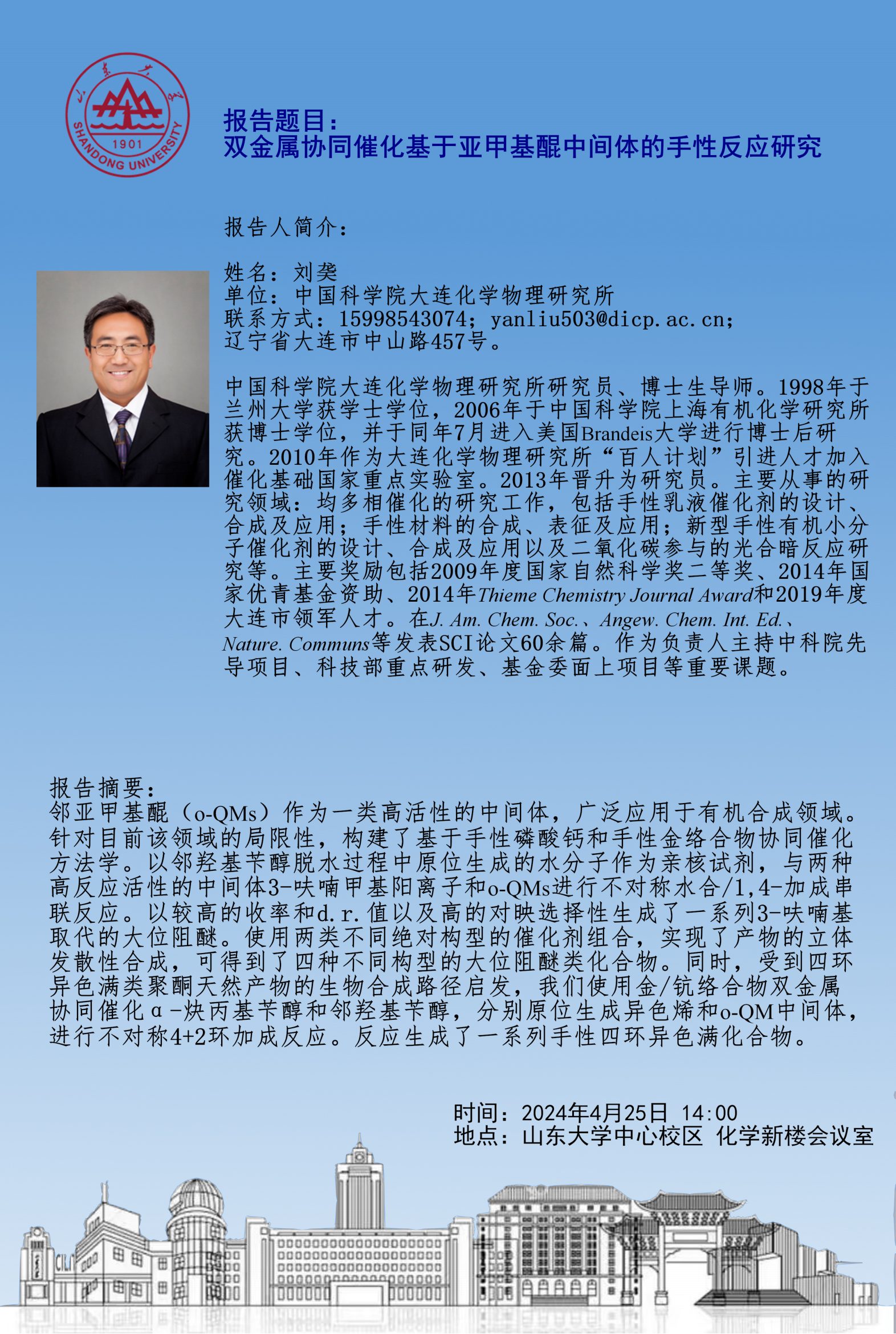 学术报告:双金属协同催化基于亚甲基醌中间体的手性反应研究