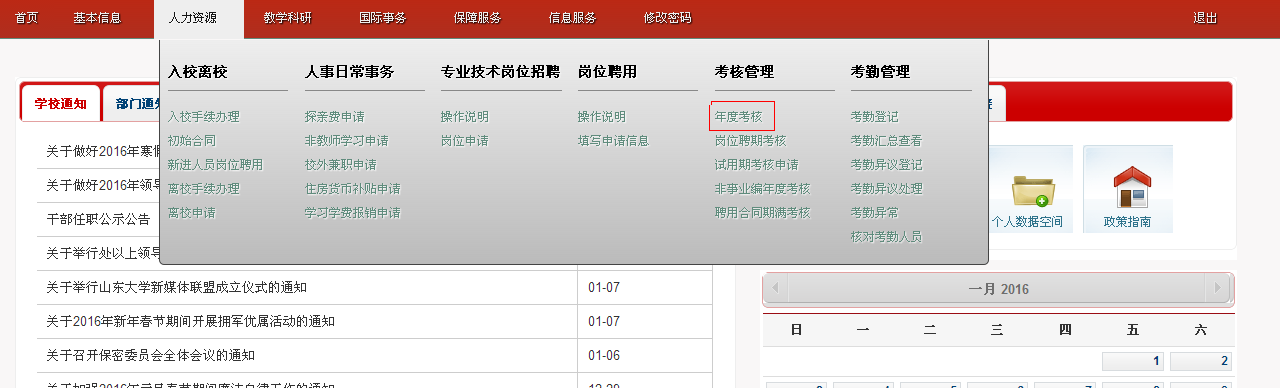 全体教职工在人力资源/考核管理/年终考核(见图一)中填写思想总结,审核教学信息,如信息不符同本科教学秘书、研究生教学秘书联系。