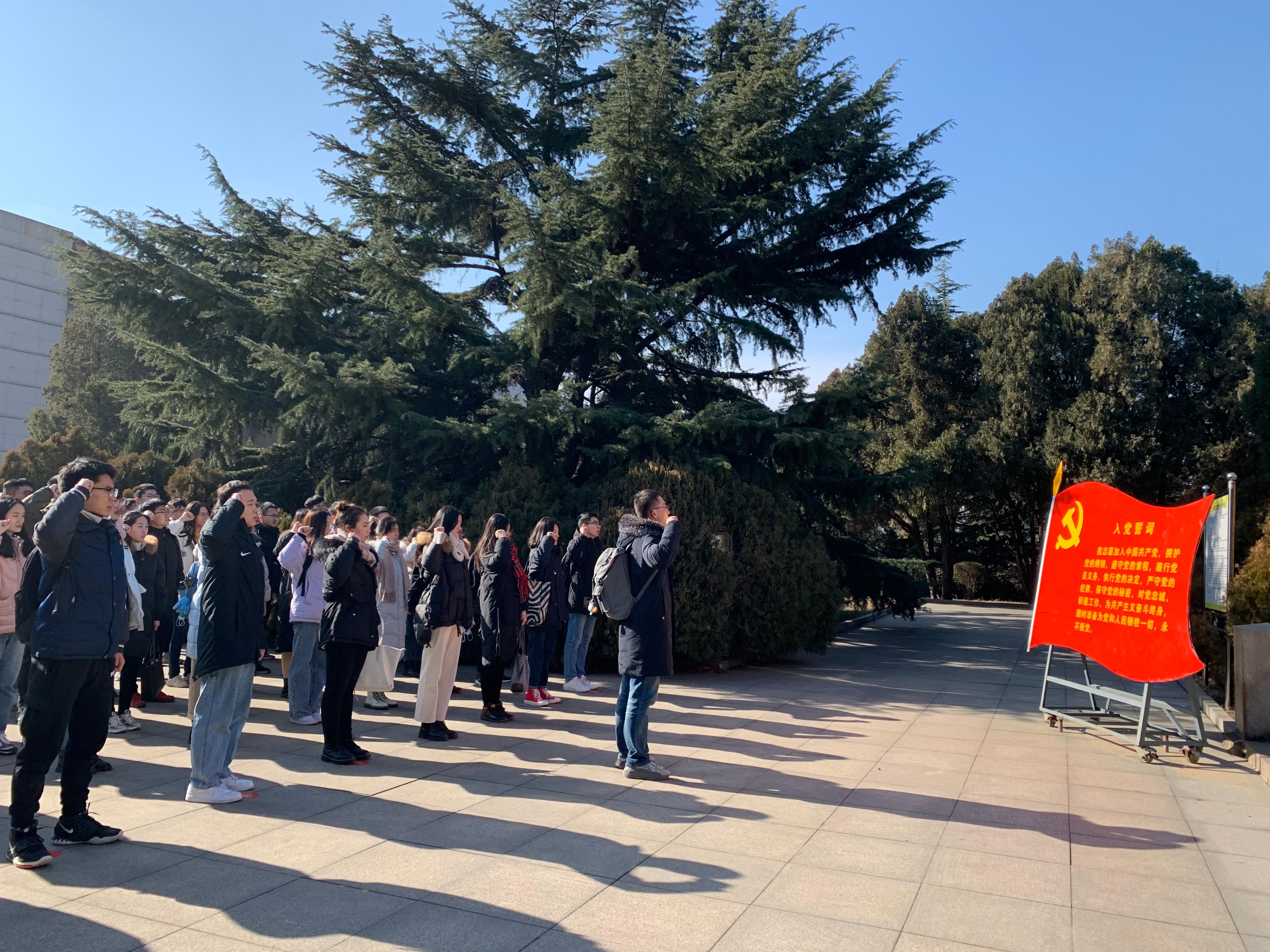 莱芜战役纪念馆由革命烈士纪念塔、莱芜战役展览馆和全景画馆、鲁中抗日战争展览馆、烈士缅怀堂四大主体建筑构成。在莱芜战役纪念馆,通过讲解员对战役的详细介绍并结合大量的历史资料,同学们对莱芜战役有了形象而又深刻的认识。展馆中陈列的一幅幅照片、一件件物证,让大家真切地感受到当时滚滚硝烟的战场上激烈而又肃穆的氛围,心灵上的震撼经久不息。在革命烈士纪念塔前,全体党员面向纪念碑再次举起右手,庄严宣誓,更加坚定自己“不忘初心、牢记使命”的信念和决心。