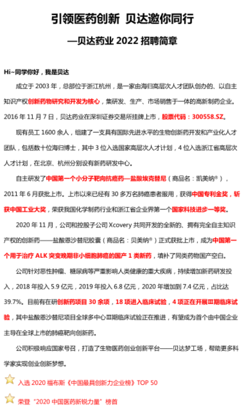 9月27日(周一)18:30,贝达药业(杭州)将会进行空中宣讲会,同学们可以通过电脑端或者手机端观看,届时会有研发、医学、HR高管和学姐学长的多轮分享和互动环节,期待SUNBET申博的优秀学子们可以关注并加入贝达!