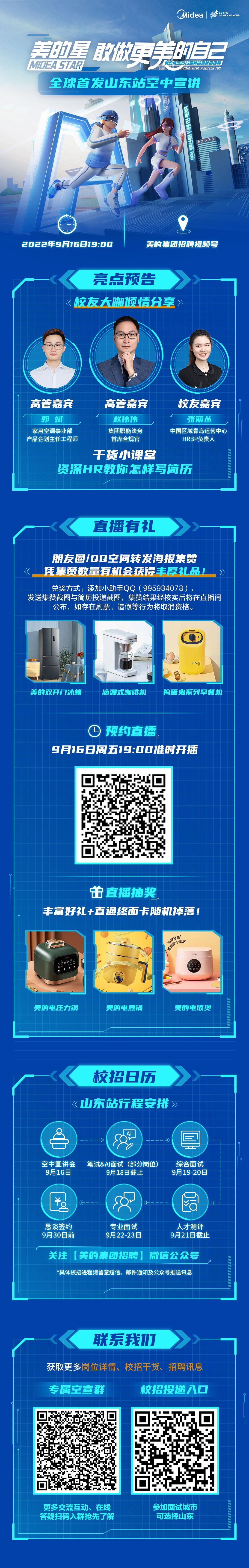 考虑到山大因疫情线上开学等因素,我们针对山大的校招整体转移为线上。美的集团将会在9月16日在开展空中宣讲会,麻烦老师将我们的宣讲会信息和招聘简章转发给同学们,谢谢。
